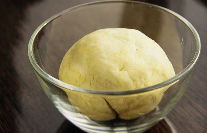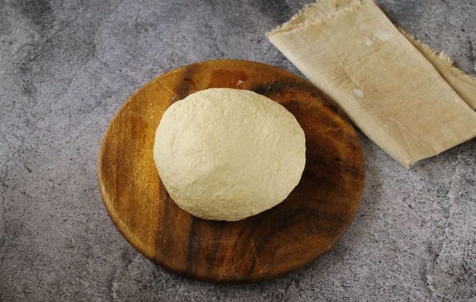 - Vul het droge mengsel geleidelijk met water en kneed het deeg tot een gladde massa. Laat het werkstuk 15-20 minuten rusten.