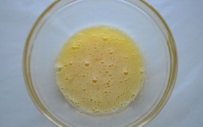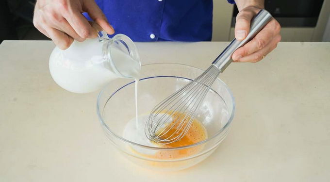- Klop de eieren apart los tot een homogeen vloeibaar mengsel.