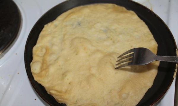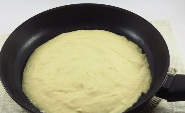 - Draai de bodem om en bak dezelfde hoeveelheid aan de andere kant. De pizzabodem in de pan is klaar, je kunt de producten die nodig zijn voor het gerecht neerleggen.