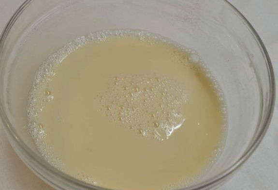 - Breek het ei tot meel. Giet in een glas droge gist met warm, maar niet heet water. Laat ze ongeveer 15 minuten brouwen en activeren.