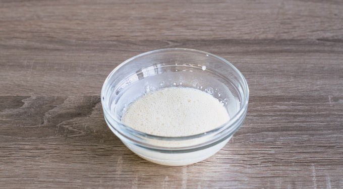 Giet droge gist in een bord, vul het met twee eetlepels warm water en roer. Laat het 15 minuten trekken. Gedurende deze tijd wordt de gist geactiveerd.