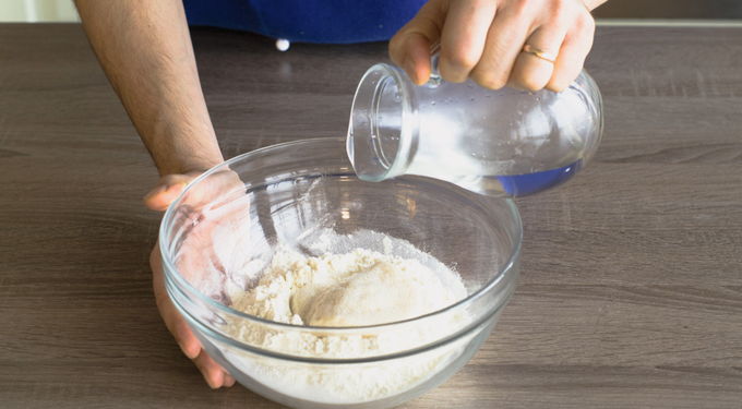 - Vul het droge mengsel geleidelijk met water en kneed het deeg tot een gladde massa. Laat het werkstuk 15-20 minuten rusten.