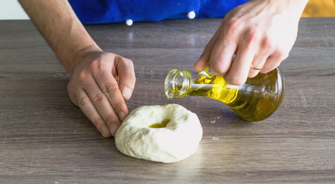 Maak een kuiltje in de klomp en giet er olijfolie in.