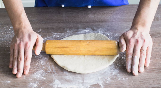 - We geven het deeg een beetje rust (3-5 minuten is genoeg), rollen het dan in bloem en rollen het uit in de vorm die nodig is voor pizza. Klaar!