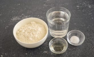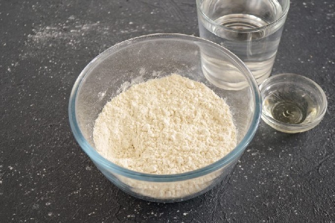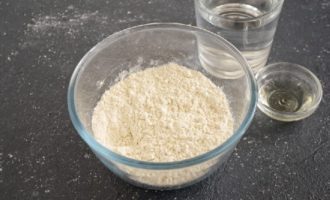 Kook het water en laat het een beetje afkoelen (het moet heet zijn, maar niet kokend). Maak een depressie in de bloem en giet er water en plantaardige olie in, meng.