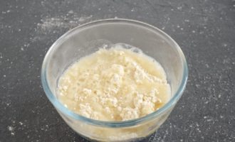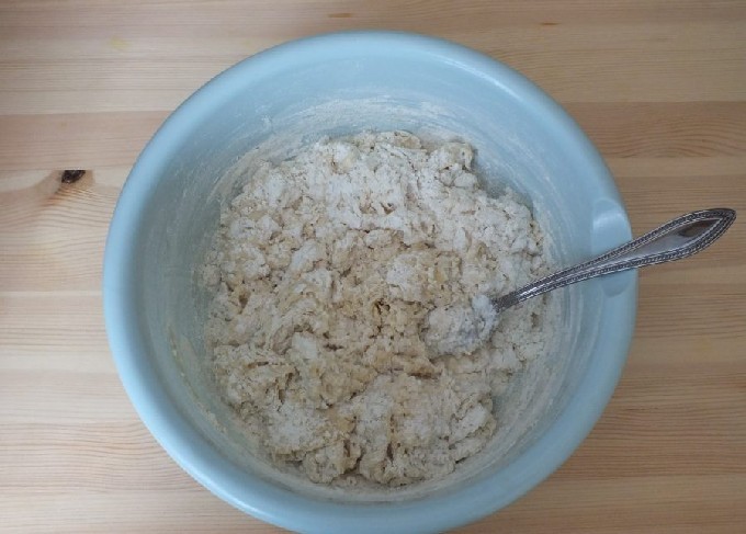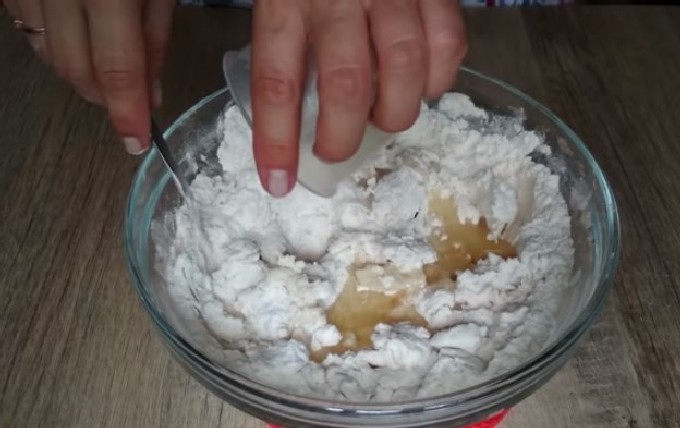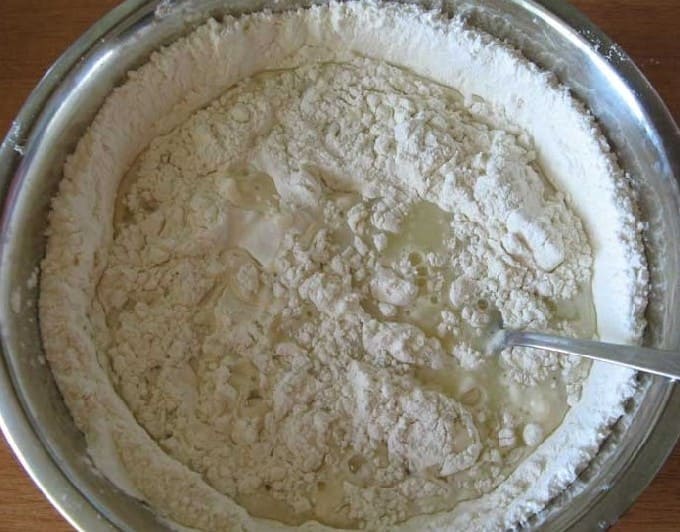 - Voeg een mengsel van vloeibare producten toe aan de helft van de bloem, begin het deeg te kneden met een vork en voeg een beetje bloem toe.