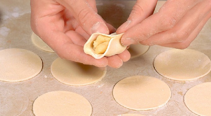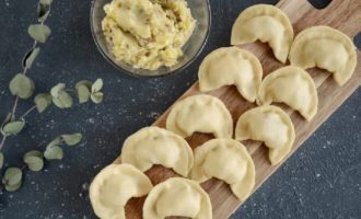Bestuif het oppervlak van de tafel licht met bloem, rol het deeg met een deegroller uit tot een dunne laag van ongeveer 2 mm dik. Snijd de cirkels uit het deeg met een glas, leg de aardappelvulling en zet de randen vast. Dumplings kunnen worden ingevroren. Het deeg zelf kan ook worden bereid, tot een dikke cake worden gerold en worden ingevroren voor toekomstig gebruik.