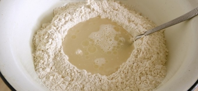 - Giet de helft van de bloem die meerdere keren van tevoren is gezeefd in een brede kom, maak een kuiltje in het midden in de bloem.