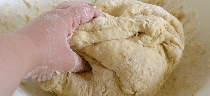 - Voeg een beetje bloem toe aan de gistoplossing en kneed het deeg met je handen tot het elastisch is. Hierdoor mag het niet aan de kom en handen blijven plakken.