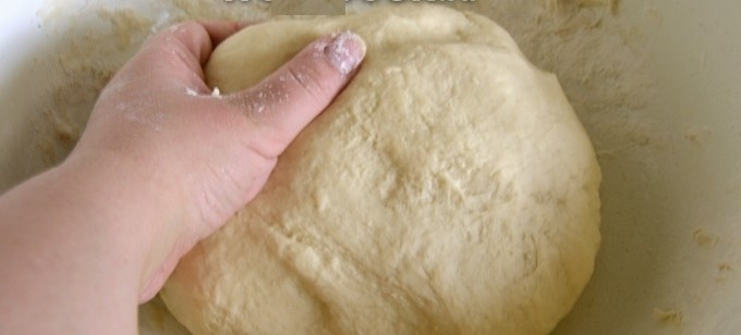 - Giet ontgeurde plantaardige olie in het deeg. Roer een beetje en laat het deeg afkoelen tot een warme staat om je handen niet te verbranden. Kneed het warme deeg 5-7 minuten op tafel tot het volledig homogeen is. Als het deeg aan je handen blijft plakken, kun je het licht bestuiven met bloem, maar gebruik niet meer dan 2 el. ik. bloem, anders wordt het deeg dicht en "rubberachtig".