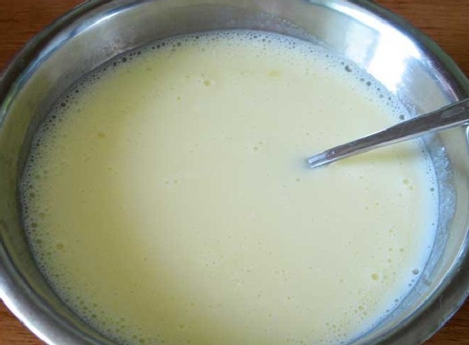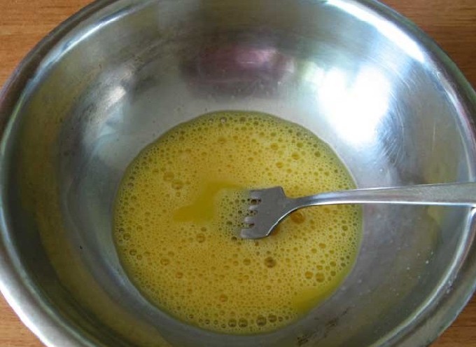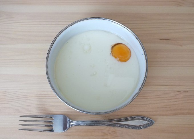 - Giet de verwarmde melk apart in een kom, klop een ei erdoor, voeg plantaardige olie en zout toe.