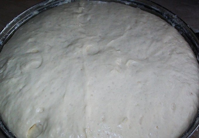 - Bedek de container met het voorbereide gistdeeg met een schone theedoek of deksel, laat 45 minuten op een warme plaats rijzen. Het deeg moet ongeveer in volume verdubbelen.