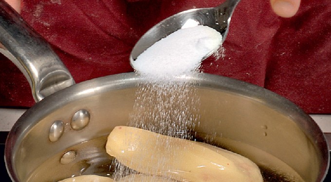 - Pureer de afgewerkte aardappelen met een stuk boter tot puree. Voeg gebakken uien, peper, zout toe en roer. Fruit de overgebleven uien met 1 eetl. ik. boter ongeveer 10 min. op laag vuur. Voeg er kristalsuiker aan toe, kook tot de suiker volledig is opgelost. Haal van het vuur, doe in een kom en laat op tafel staan.