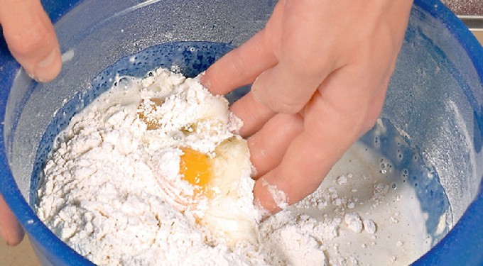 - Voeg water toe aan het kuiltje in de bloem en roer met een lepel.