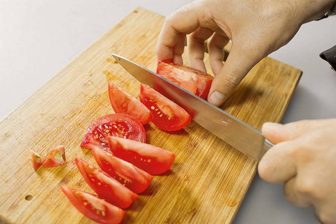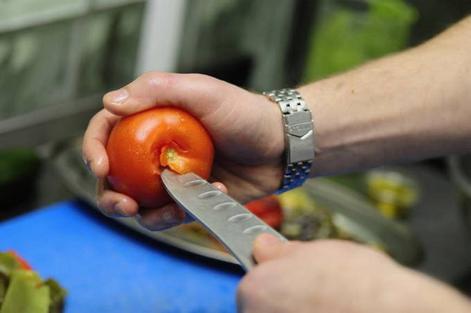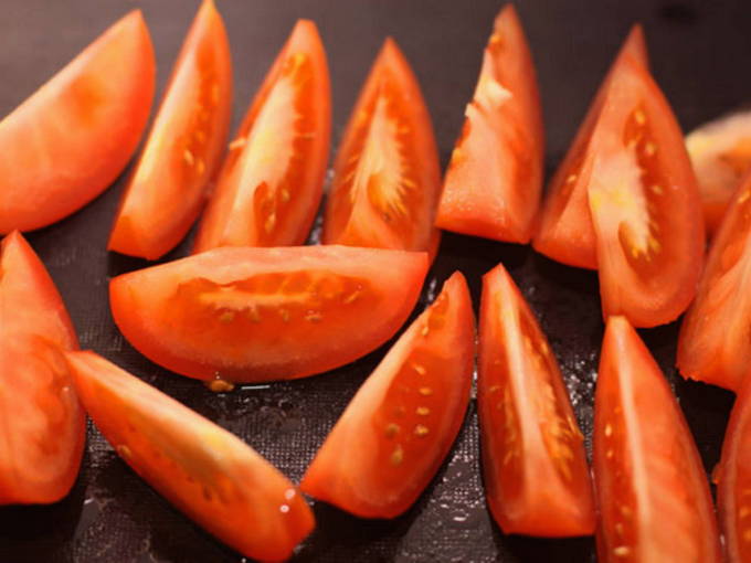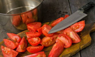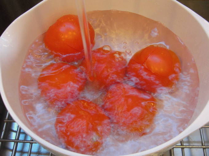 - Verwijder indien nodig de schil van de tomaten voordat u ze in plakjes snijdt. Giet de tomaten met vooraf bereid kokend water en laat een paar minuten staan. Daarna laten we het hete water weglopen en dompelen de tomaten in koud water. Verwijder na twee minuten de schil van de tomaten.