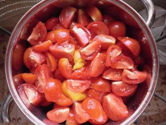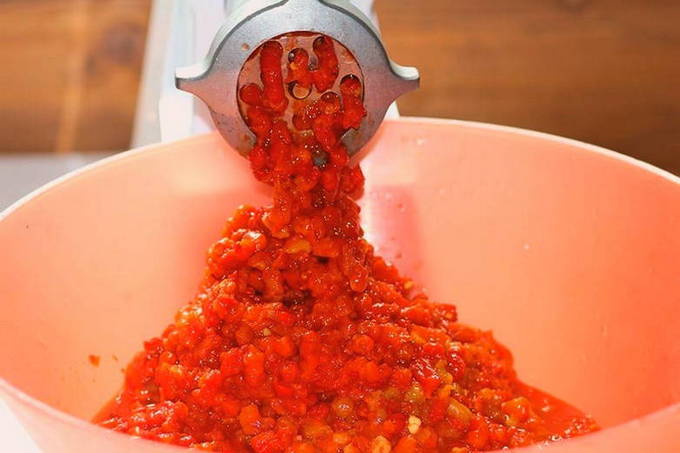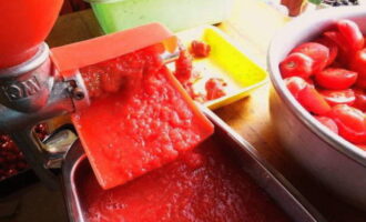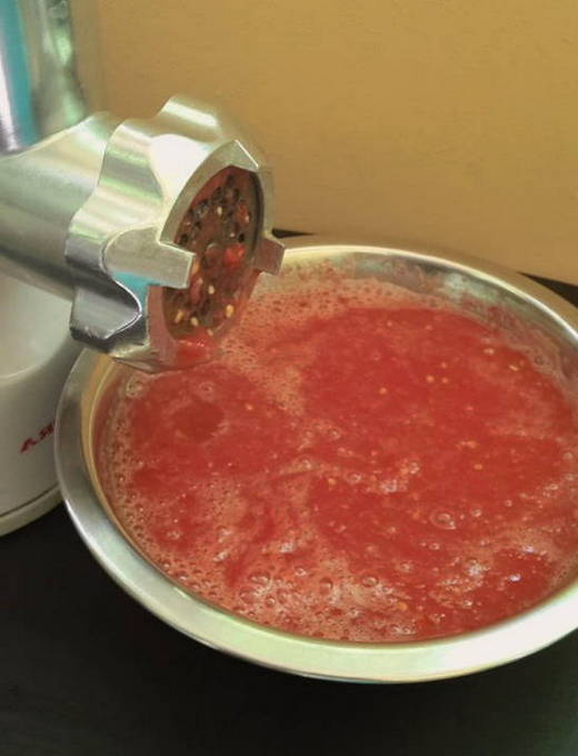 - Als er een verlangen is, ontdoen we de tomaten van de schil. Daarna snijden we ze en halen ze door een vleesmolen.