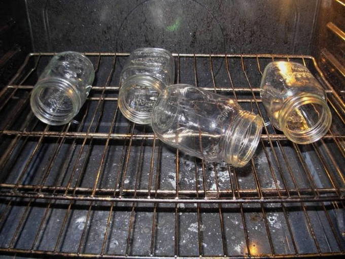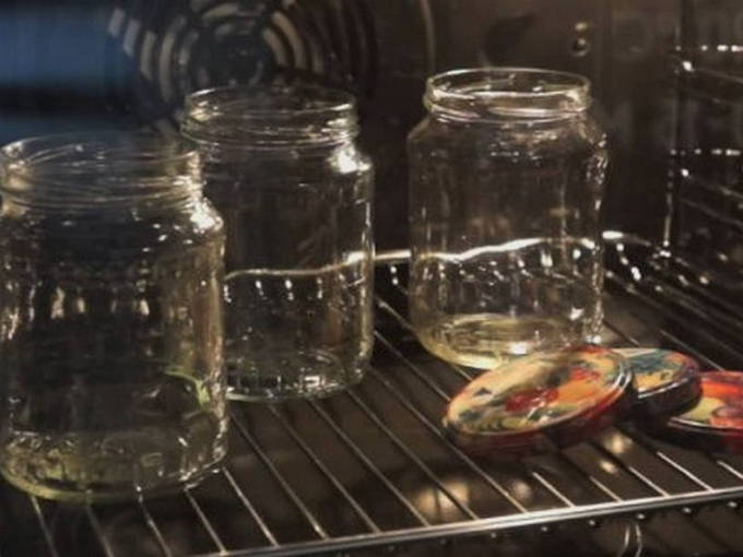 - Wij controleren blikken en deksels op scheuren, schilfers en andere gebreken. Kies de juiste en maak ze schoon met zuiveringszout. Daarna spoelen en steriliseren we grondig gedurende ongeveer 10-15 minuten in de oven.
