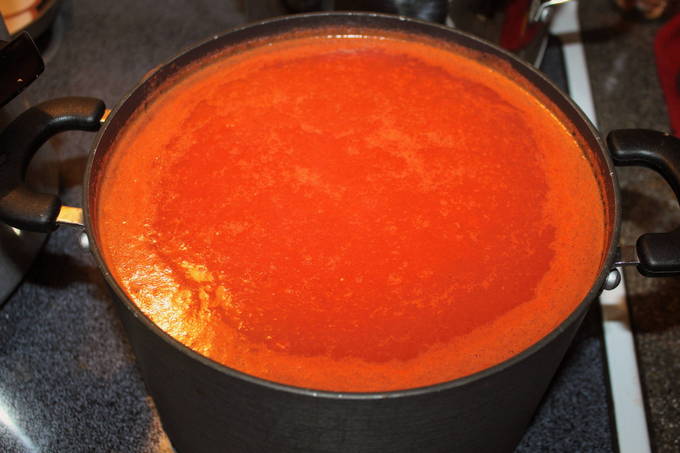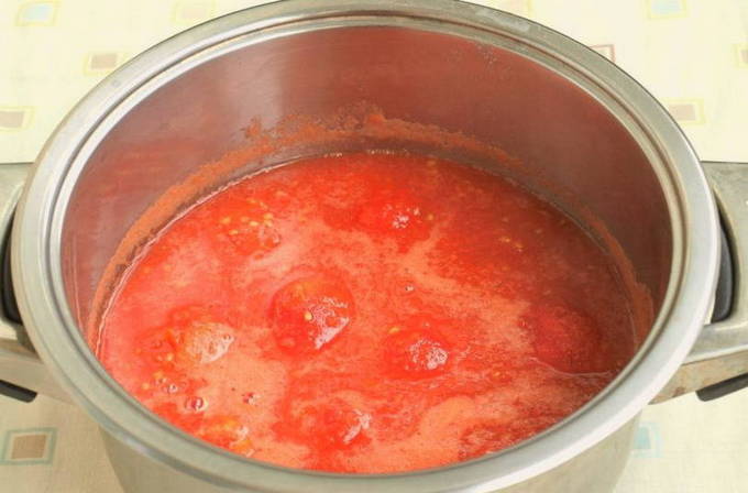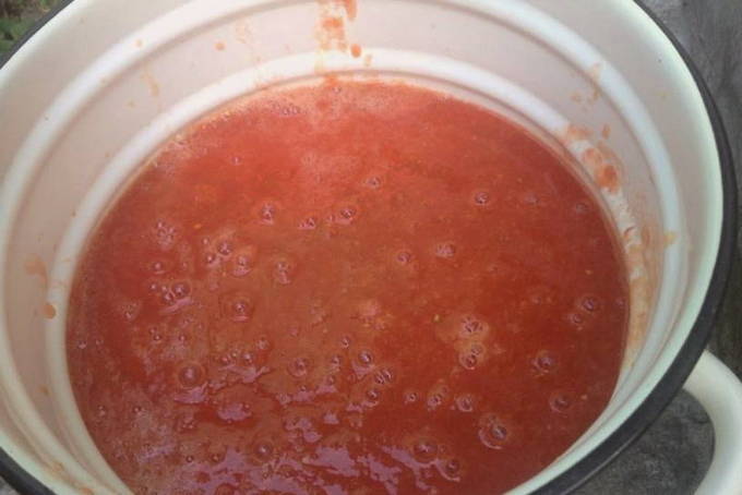 - We verspreiden de tomaten in een vleesmolen en bereiken hun transformatie tot aardappelpuree. Giet de massa in een pan, die we op het fornuis zetten. Breng de gesneden tomaten aan de kook, verwijder het schuim. Daarna maken we het vuur minder en koken we de massa 30 minuten.