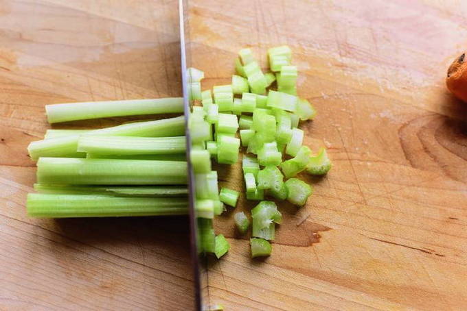 - We wassen de selderij en drogen deze af met een papieren handdoek. Snijd de bleekselderij in kleine stukjes. Giet in een pan met tomatensap, voeg zout toe. Breng de drank weer aan de kook.