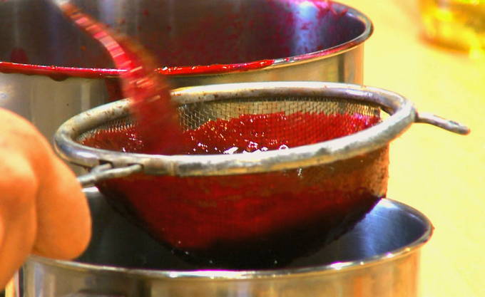 - Plaats een zeef met kleine gaatjes op een grote pan. Schenk de massa uit de blender erin en filtreer deze met een lepel tot er alleen velletjes en zaadjes op het rooster overblijven.