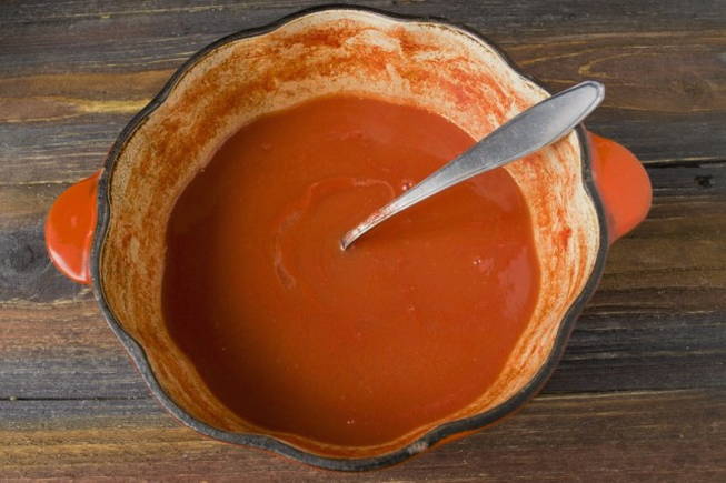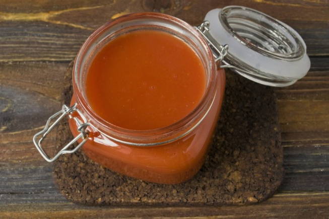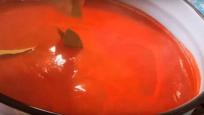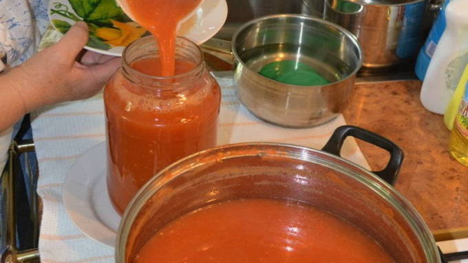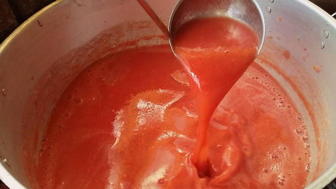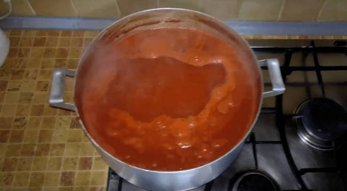 - We koken de tomatendrank tot de gewenste dikte. Giet vervolgens het hete mengsel in de potten. We bedekken ze met deksels en rollen ze op.