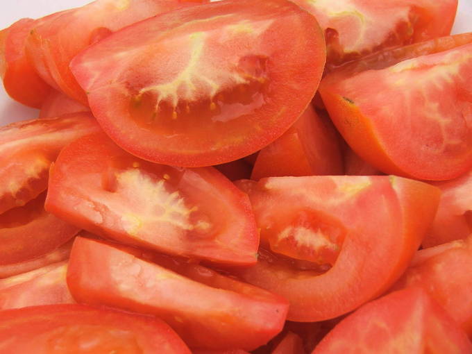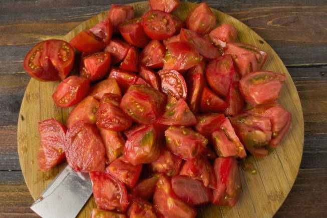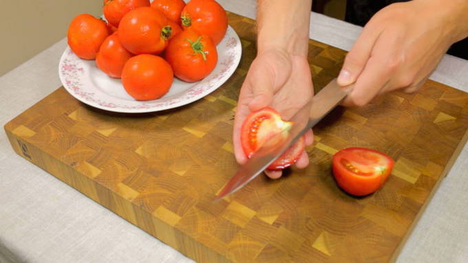 - Spoel verse tomaten af met stromend water en droog ze af met een schone handdoek. Vervolgens verwijderen we de zegels op de plaatsen waar de stengels waren bevestigd, en andere defecten. Snijd de tomaten in losse stukken.