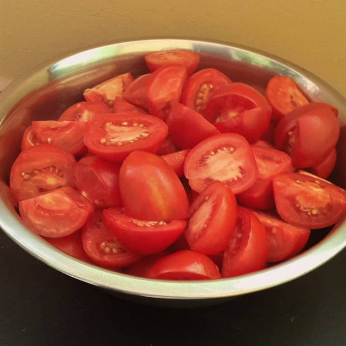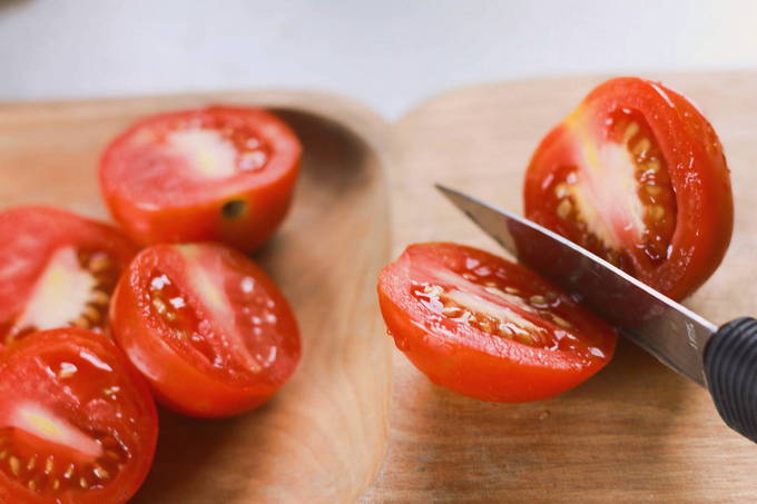 We wassen de tomaten en vegen ze af met een theedoek. Snijd de tomaten doormidden met een scherp mes (je kunt ze in 4 delen snijden). Snijd de plaats af waar de stengel is bevestigd.
