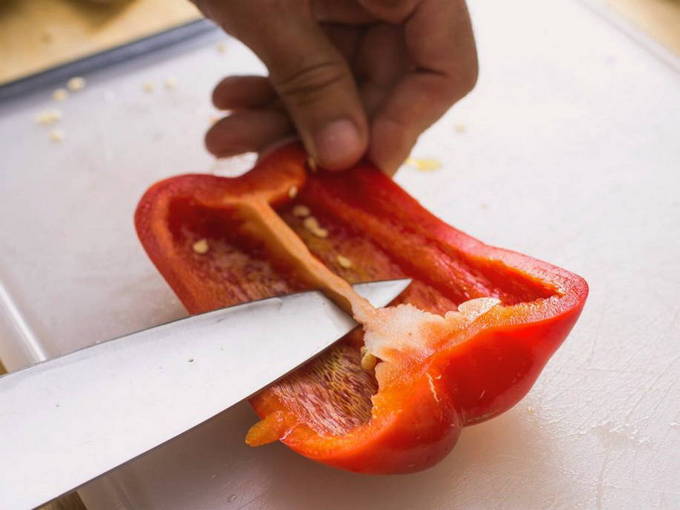 - We wassen de paprika's. Veeg het droog en snijd het in twee delen langs het fruit. We maken de zaden schoon met een scherp mes en snijden de witte film eruit. Spoel de peper nogmaals af. Snijd in kleine stukjes en doe in een sapcentrifuge. Maal en stuur naar tomatensap.