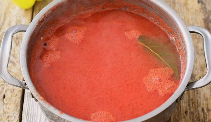Giet het tomatensap in een grote pan met dikke bodem en voeg zout toe. Meng de ingrediënten. We zetten de container op het fornuis. We zetten de techniek aan en brengen het sap aan de kook. Laat even koken en verwijder het schuim.