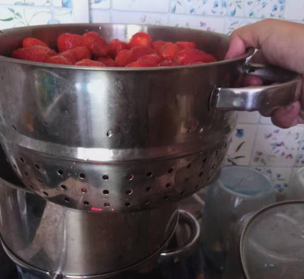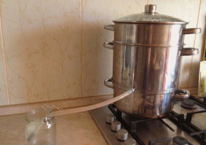 - We zetten de sapcentrifuge op de brander. We installeren de siliconenslang en laten het andere uiteinde in de pot zakken.We maken een groot vuur en koken het sap. Wanneer het water in de onderste container kookt, zet u het vuur lager. We zorgen ervoor dat al het water niet lang kookt voordat het sap helemaal klaar is. Wanneer alleen zaden en schillen in de bovenste laag achterblijven, kan de kachel worden uitgeschakeld.
