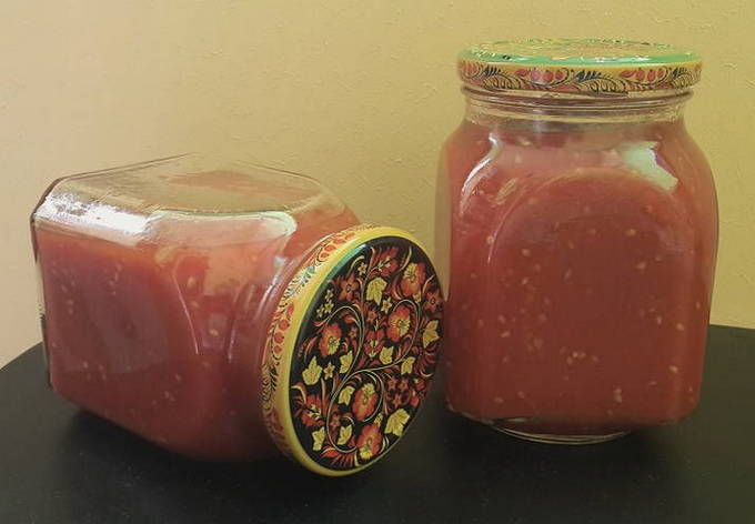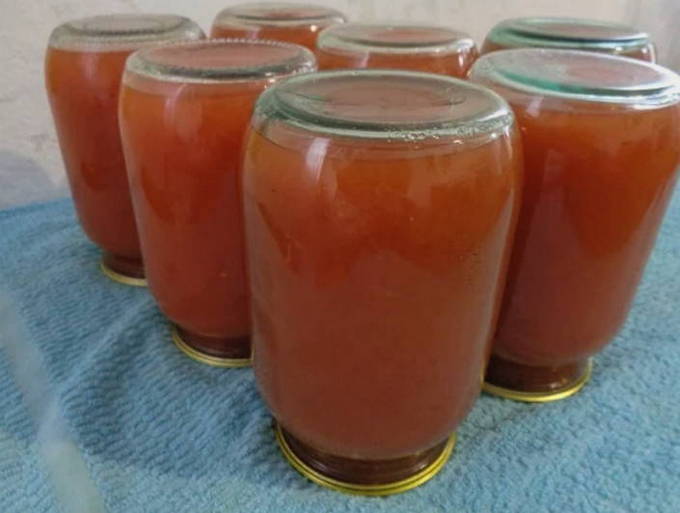 - We selecteren hele blikken en deksels voor het rollen van tomatensap. We maken ze schoon en spoelen ze grondig af. We zetten de container in de oven voor sterilisatie. Giet tomatensap met pulp in schone potten. Bedek de potten met deksels en rol ze op. We zetten containers met sap ondersteboven op elke geschikte plaats en bedekken met een deken totdat het volledig is afgekoeld.