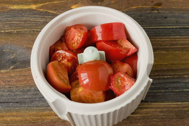 - We wassen de tomaten in koud water en vegen ze goed af met een handdoek. We ontdoen de vrucht van rot, zwartheid en andere gebreken. Snijd de tomaten in kleine stukjes zodat ze in de blender passen. We verwijderen de stelen en hun bevestigingspunten.