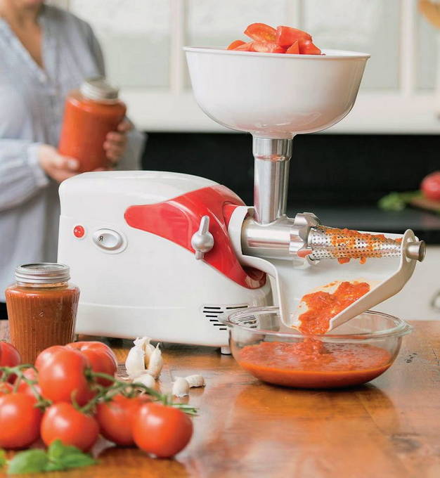 Meestal wordt bij het bereiden van tomatensap een sapcentrifuge of vleesmolen gebruikt. Als ze er niet zijn, is een gewone blender geschikt om het fruit te hakken.