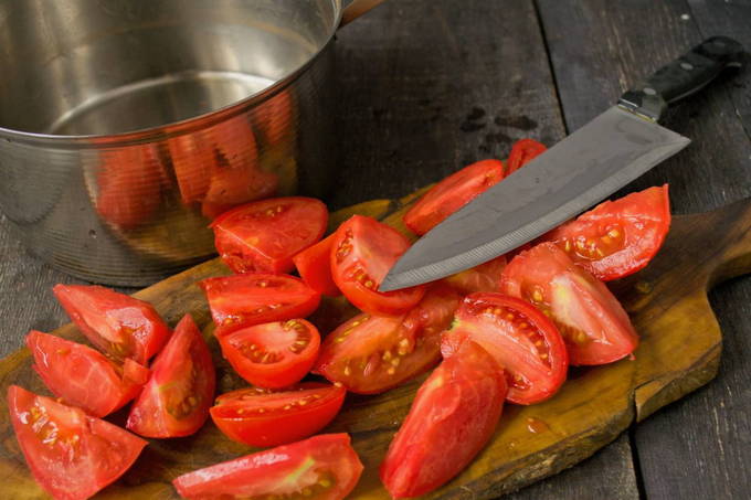- We wassen verse tomaten. We vegen ze droog met een schone handdoek en verwijderen verschillende beschadigingen (rot, mee-eters). Vervolgens knippen we de bevestigingspunten van de stelen uit. Snijd de tomaten in middelgrote stukken.