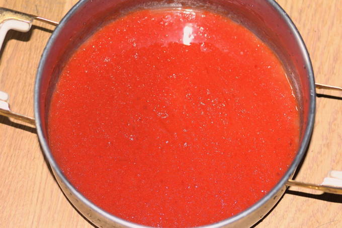 - We verspreiden de tomaten in een vleesmolen en bereiken hun transformatie tot aardappelpuree. Giet de massa in een pan, die we op het fornuis zetten. Breng de gesneden tomaten aan de kook, verwijder het schuim. Daarna maken we het vuur minder en koken we de massa 30 minuten.