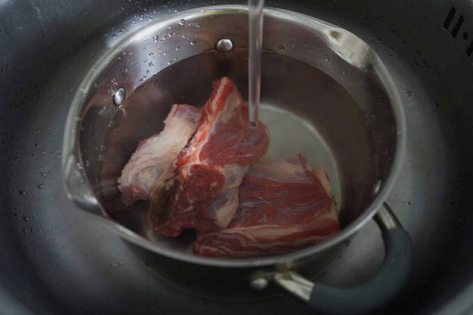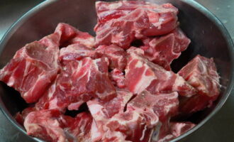 - Het vlees wordt gewassen en in porties gesneden. Giet het dan over met koud water en kook ongeveer 2 uur.