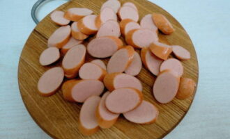 Worsten worden in cirkels gesneden en licht gebakken, dan moet je ze in een andere kom doen.