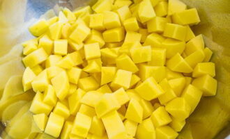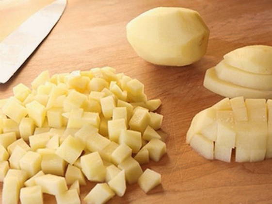- Snijd de aardappelen in blokjes. Giet rijst in kokend water en breng na 5 minuten aardappelen naar dezelfde plaats.