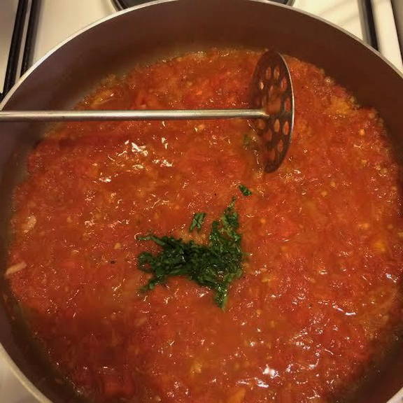 - Leg de plakjes tomaat in een pan en kook gedurende 10 minuten, onder voortdurend roeren. Breng op smaak met zout, zwarte peper en oregano. Breng op smaak door een beetje toe te voegen