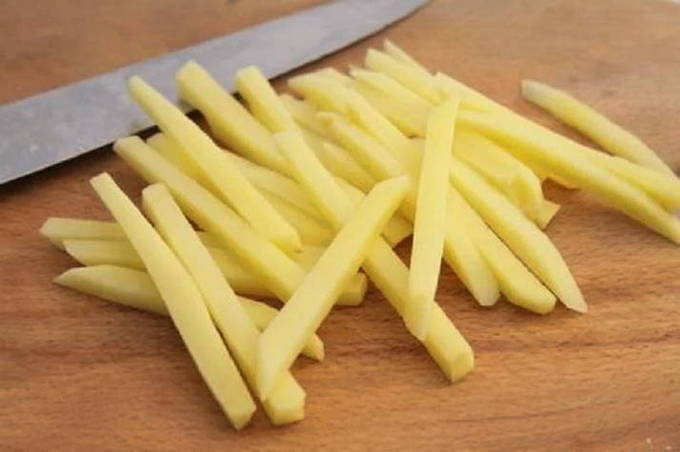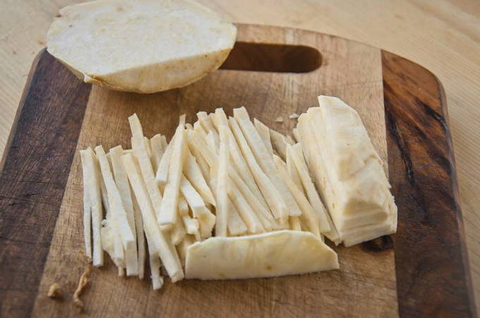 - Gerookt vlees wordt in reepjes gesneden of in vezels verdeeld, je moet het bakken samen met de helft van de ui die je wilt hakken.