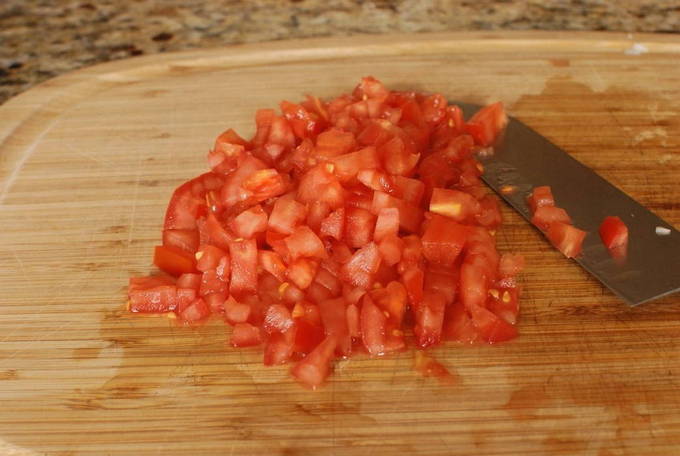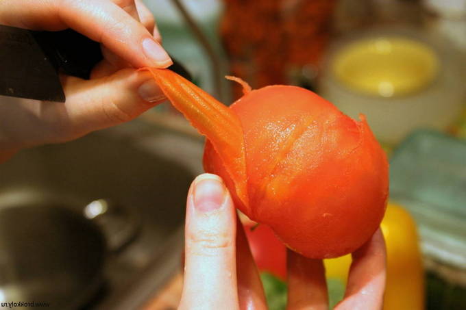 - Verwijder de schil van de tomaten, verwijder de zaden en binnenwanden van de paprika, snijd de groenten in gelijke blokjes.
