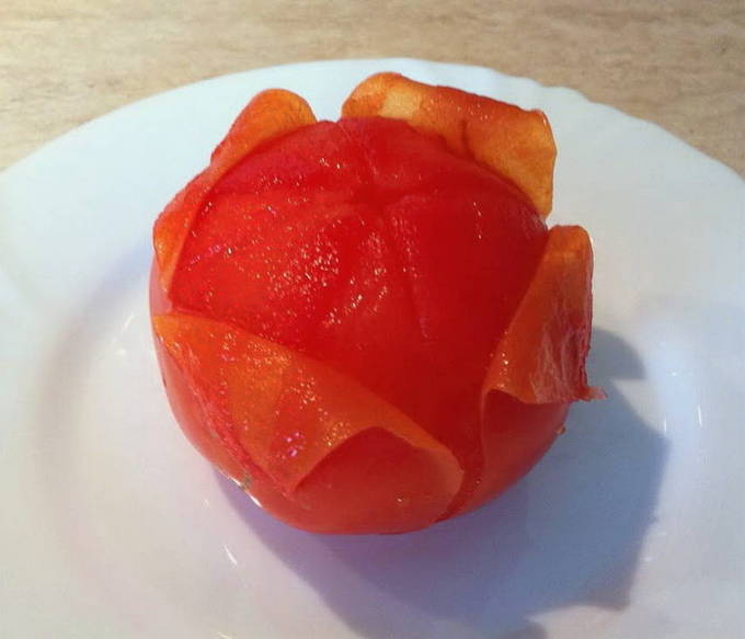- Verwijder steeltjes van gewassen tomaten en schil ze, snijd ze in grote plakjes.