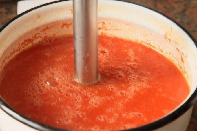 - Giet de bouillon in een pan met tomaten, dek af en kook op zeer laag vuur gedurende 10 minuten. Pureer daarna de massa zodat deze homogeen wordt.