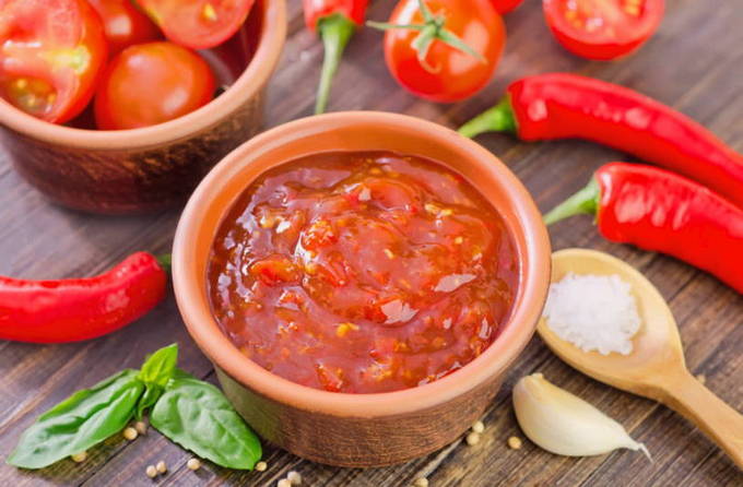 De ui wordt fijngehakt en gekookt in een koekenpan waar de worstplakken zijn gebakken. Wanneer de groente transparant wordt, voeg je er gehakte knoflook, grote gesneden tomaten en tomatenpuree aan toe. Een beetje water wordt toegevoegd en de massa wordt enkele minuten op laag vuur gestoofd, waarna het een beetje moet worden gezouten en gepeperd.