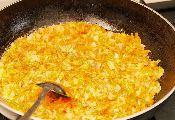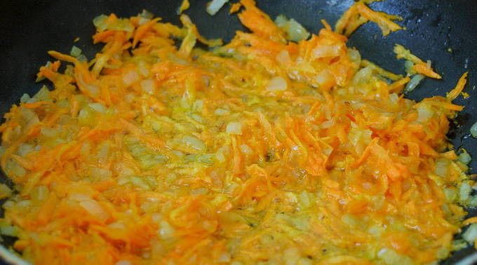 - Bereid frituren voor van uien en wortels. Het moet een mooie gouden kleur krijgen.