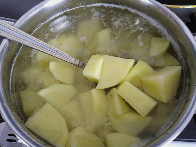 - Snijd de geschilde aardappelen in grote plakken en kook ze in de bouillon gedurende 15 minuten tot ze heel zacht zijn.