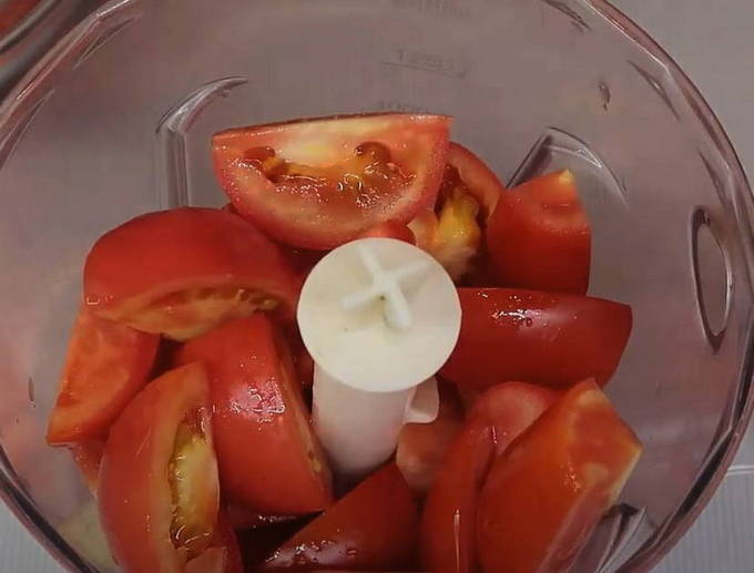 - Verwijder de schil van de tomaten en pureer ze, na het verwijderen van de zaden. Om dit te doen, kunt u een blender of keukenmachine gebruiken.