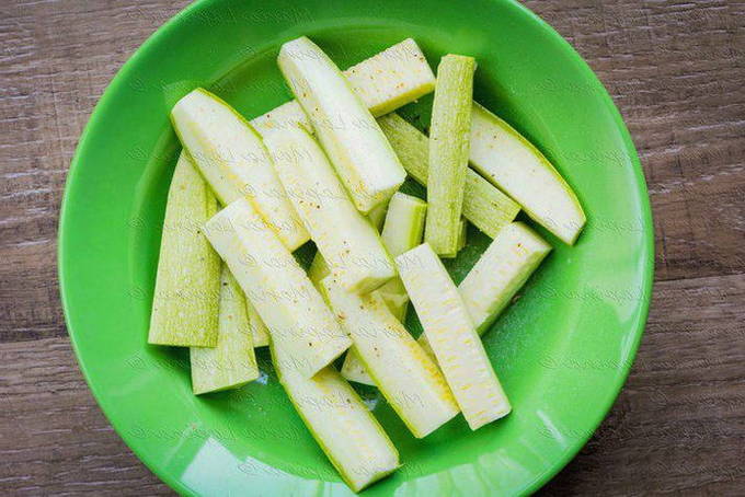 - Jonge courgette kun je niet schillen, maar alleen goed afspoelen en in blokjes of blokjes snijden.