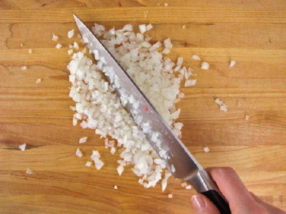 - Uien, in kleine blokjes gesneden, bak 4-5 minuten in een pan in het vet verwijderd uit de bouillon.