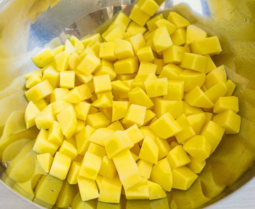- Snijd de geschilde aardappelen in grote plakken en kook ze in de bouillon gedurende 15 minuten tot ze heel zacht zijn.